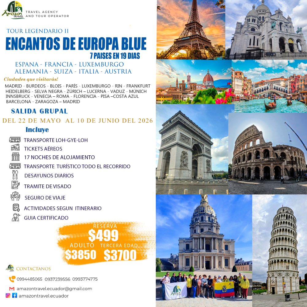 Durante este viaje recorrerás las ciudades más icónicas de Europa, desde la elegancia de Madrid y París, hasta la historia viva de Roma y Florencia. Descubrirás castillos medievales en Alemania, la magia de Venecia, la modernidad de Zúrich, y la belleza de la Costa Azul. Una experiencia única de 20 días donde vivirás historia, cultura, gastronomía y paisajes inolvidables. 🌍✈️🍷
